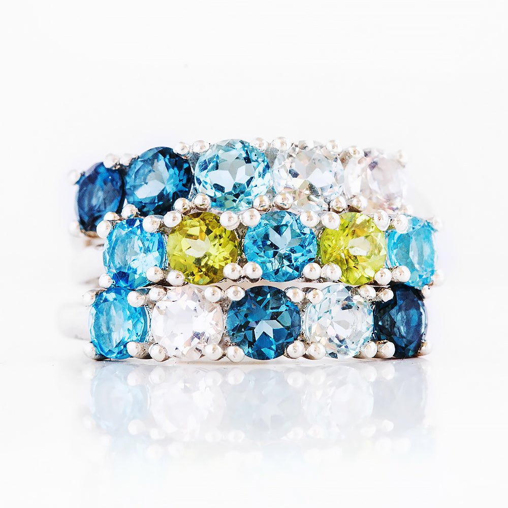 Topaz features calming blue tones reminding us of those perfect beach days. Citrine contrast with bright yellow through to amber colours.
