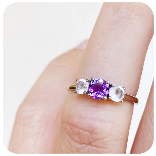 Amethyst and Rose Quartz Round cut Trilogy Ring