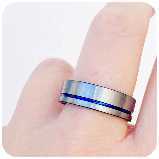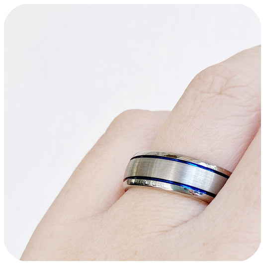 Austen, a Double Blue Groove and Brushed Surface Tungsten Ring - 8mm