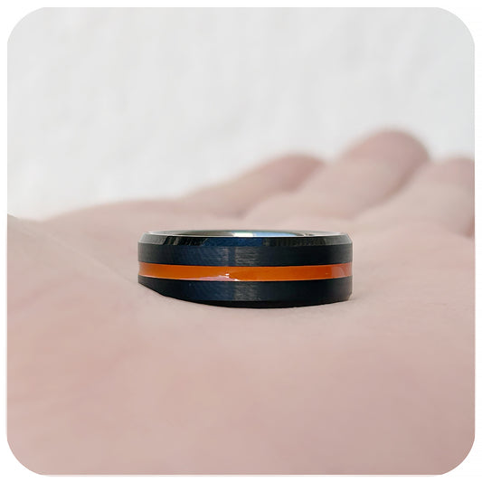 Matteo, a Matt Black with Orange Racing Line Tungsten Ring - 8mm