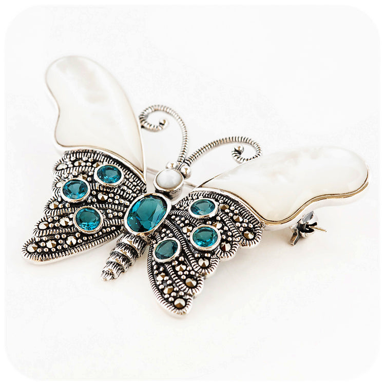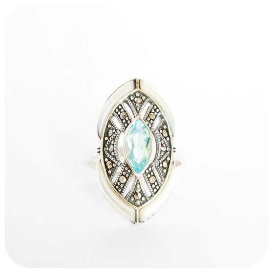 Blue Topaz and Mother of Pearl Shield Ring in Sterling Silver