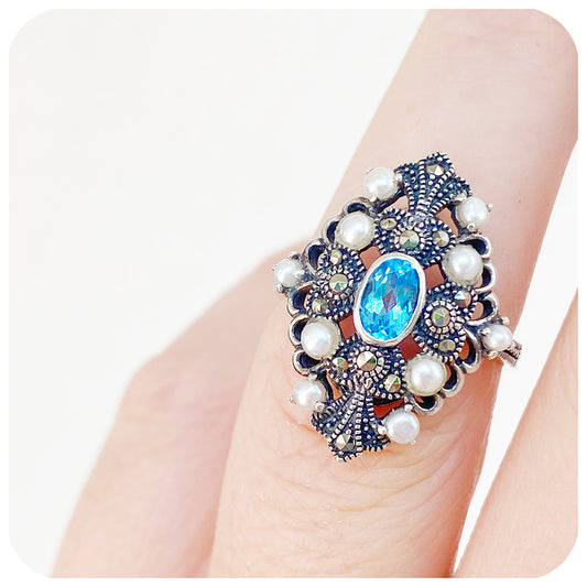 Swiss Blue Topaz and Pearl Ring with Marcasite
