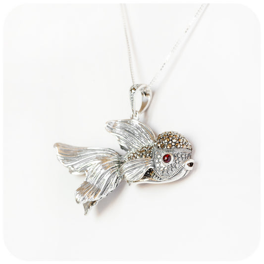 The Goldfish, a Marcasite and Garnet Pendant in Sterling Silver