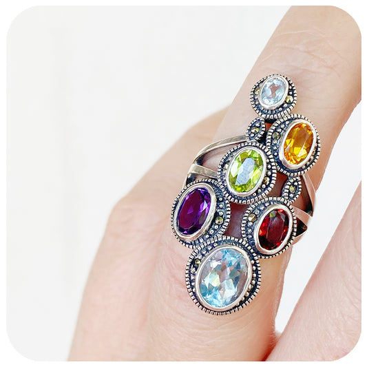The Rainbow Multi-Colour Ring in Sterling Silver with Marcasite