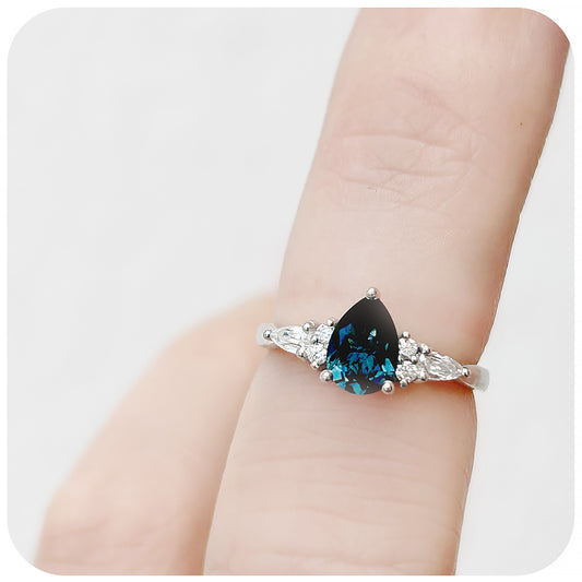 Ariana Mini, a Pear cut London Blue Topaz and Moissanite Trellis Ring