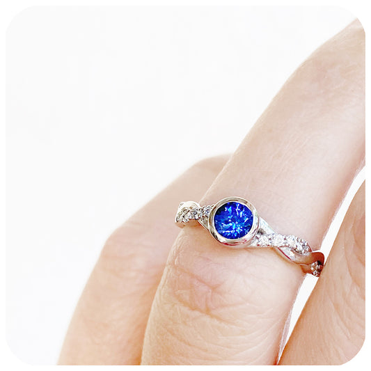 Lea, a Lab Sapphire and Diamond Trilogy Engagement Ring