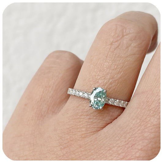 Adriana, a Light Blue Moissanite Engagement Ring