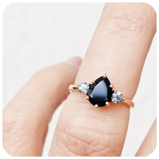 Sienna, a Black Moissanite and Aquamarine Trilogy Ring