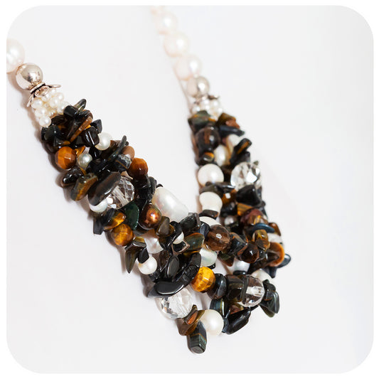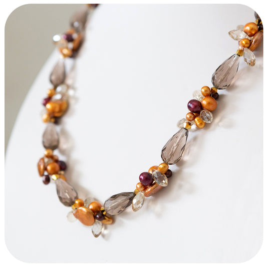 Smoky Quartz, Biwa and Fresh Water Pearl Necklace with Crystal Element Detail - 58cm