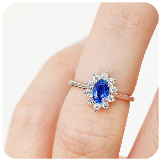 Eva, a Blue Sapphire and Moissanite Halo Ring