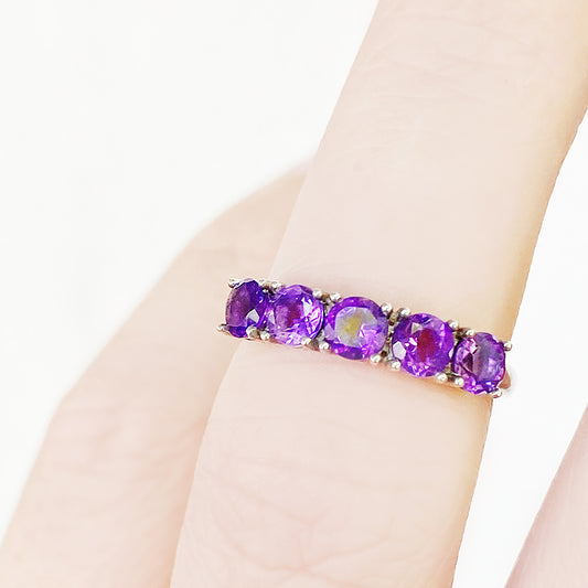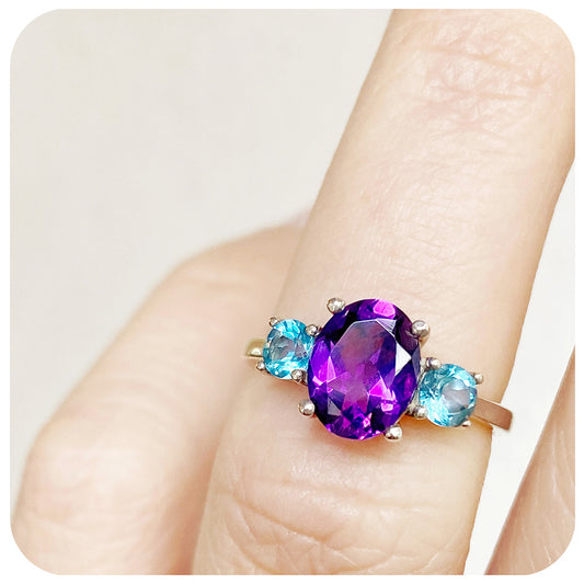 Hallie, an Amethyst and Swiss Blue Topaz Trilogy Ring