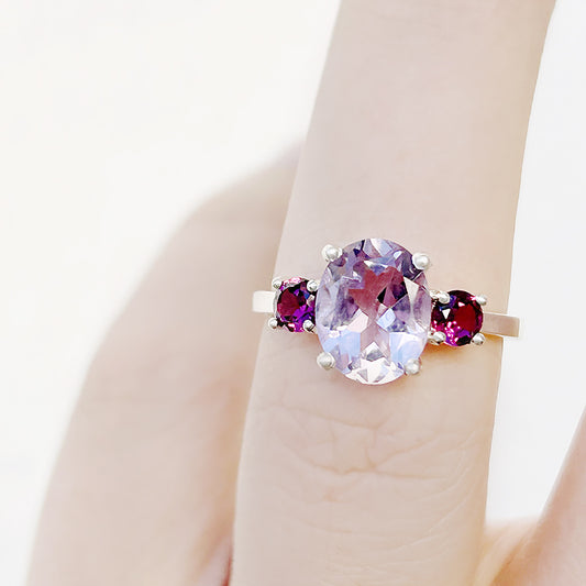 Hallie, a Pink Amethyst and Rhodolite Trilogy Ring