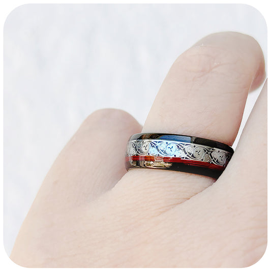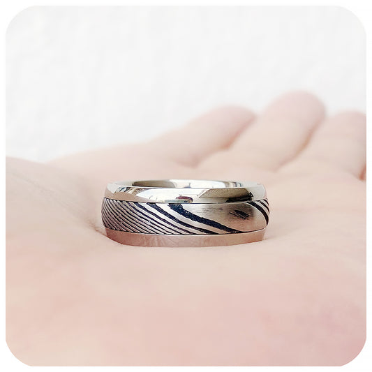 Red Racer, Silver and Black Damascus Mens Wedding Ring - 8mm