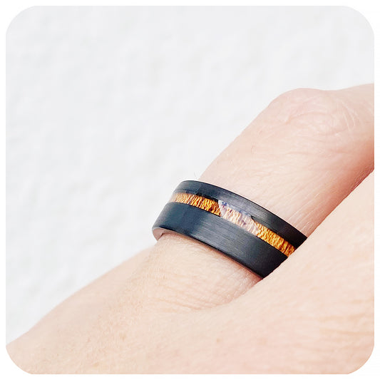 Levi, a Matt Black with Orange Racing Line Tungsten Ring - 8mm