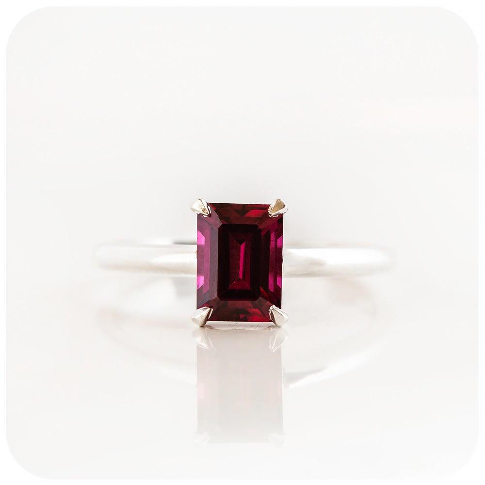 Mari, an Emerald cut Rhodolite Solitaire Ring