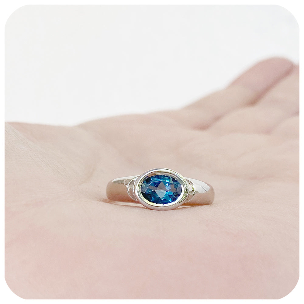 London Blue Topaz features silky hues of blue and teal and has an incredible calming effect on the wearer. We can make this ring in any size and with your choice of stone.