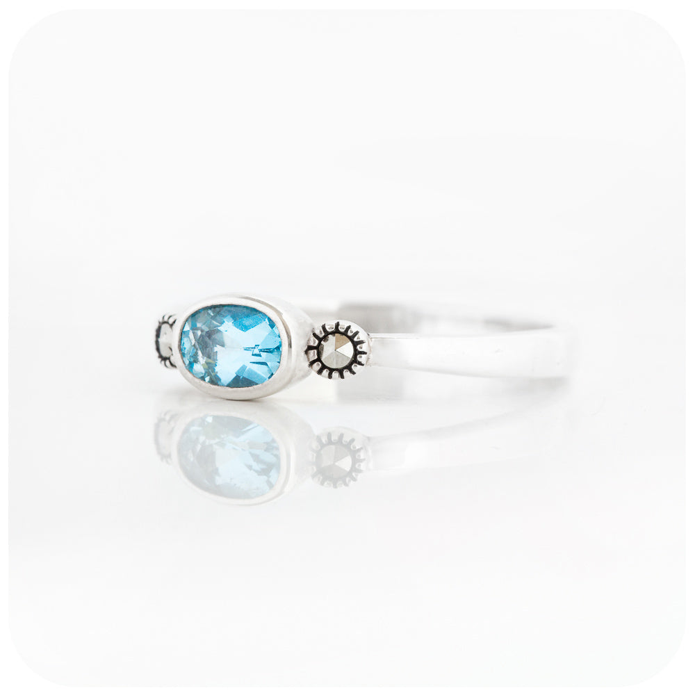 Oval cut Swiss Blue Topaz and Marcasite Stack Ring in Sterling Silver