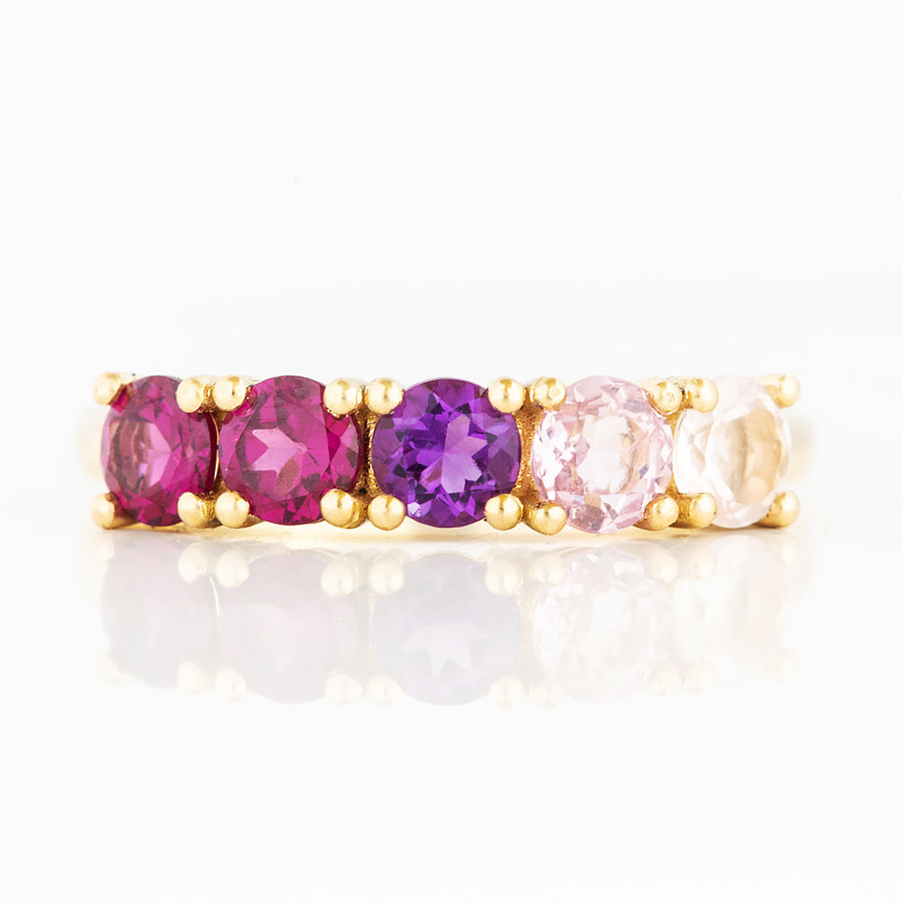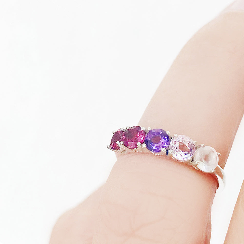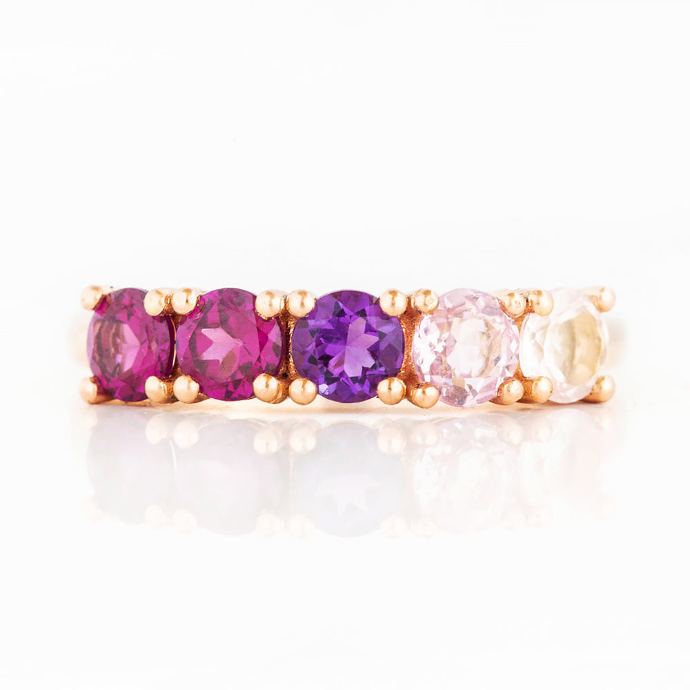 Rhodolite Garnet is the pinkish/red variety of Garnet and has a stunning brilliance and sparkle. It is known as the stone of inspiration and guidance. Amethyst is centred in the ring is said to be a protective stone for the wearer. Morganite is the stone of love in abundance, it attracts, stores and gives love when it's needed. Rose Quartz is the last of the stones and restores trust and harmony and creates inner peace.