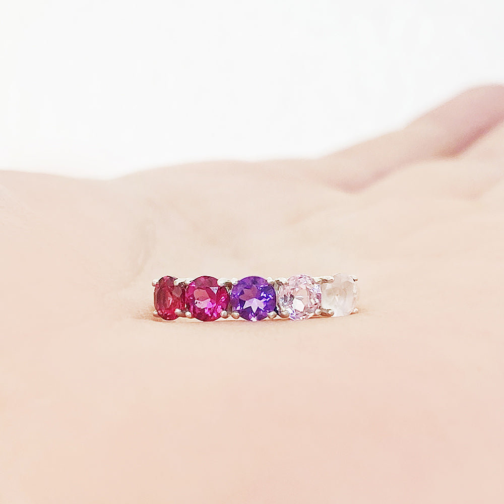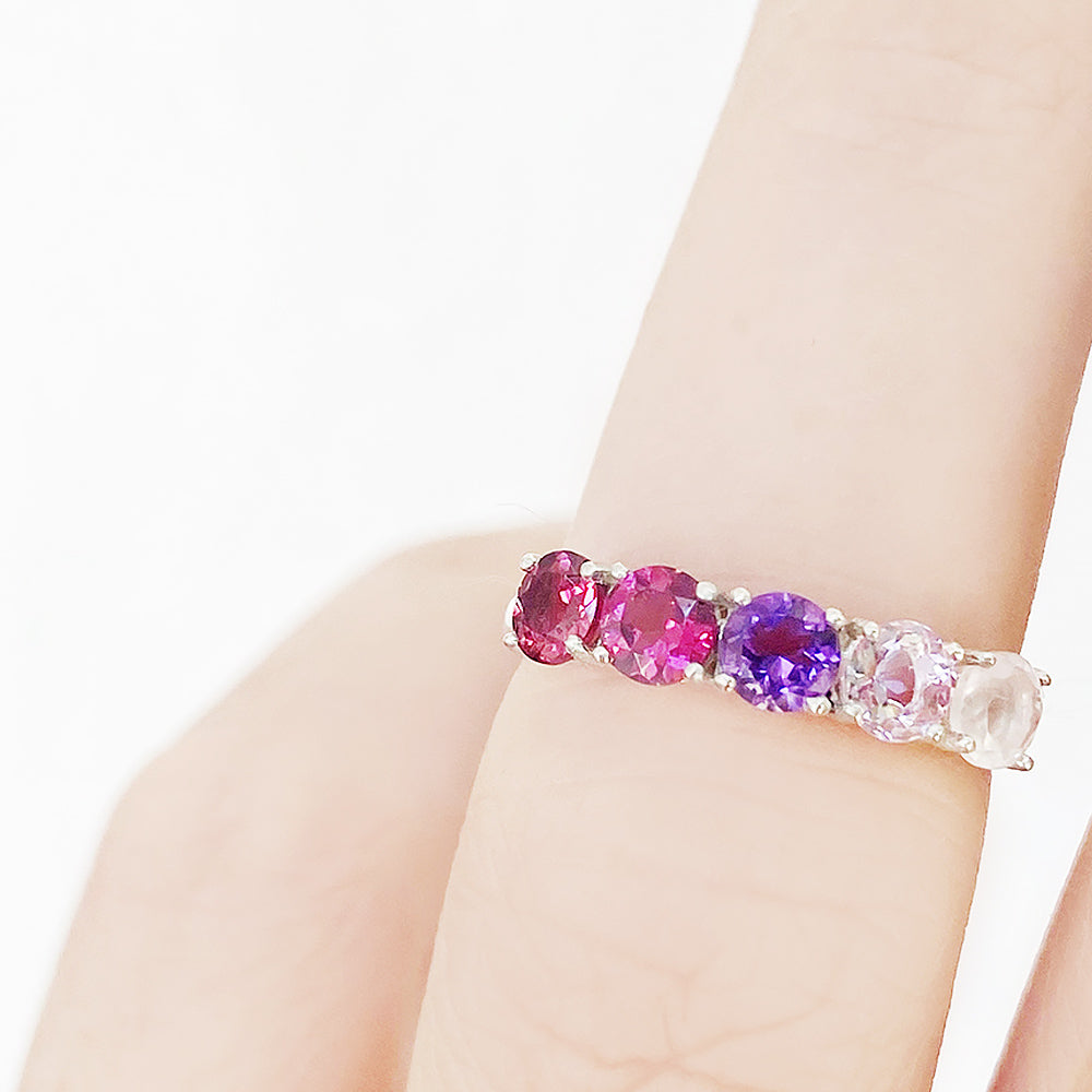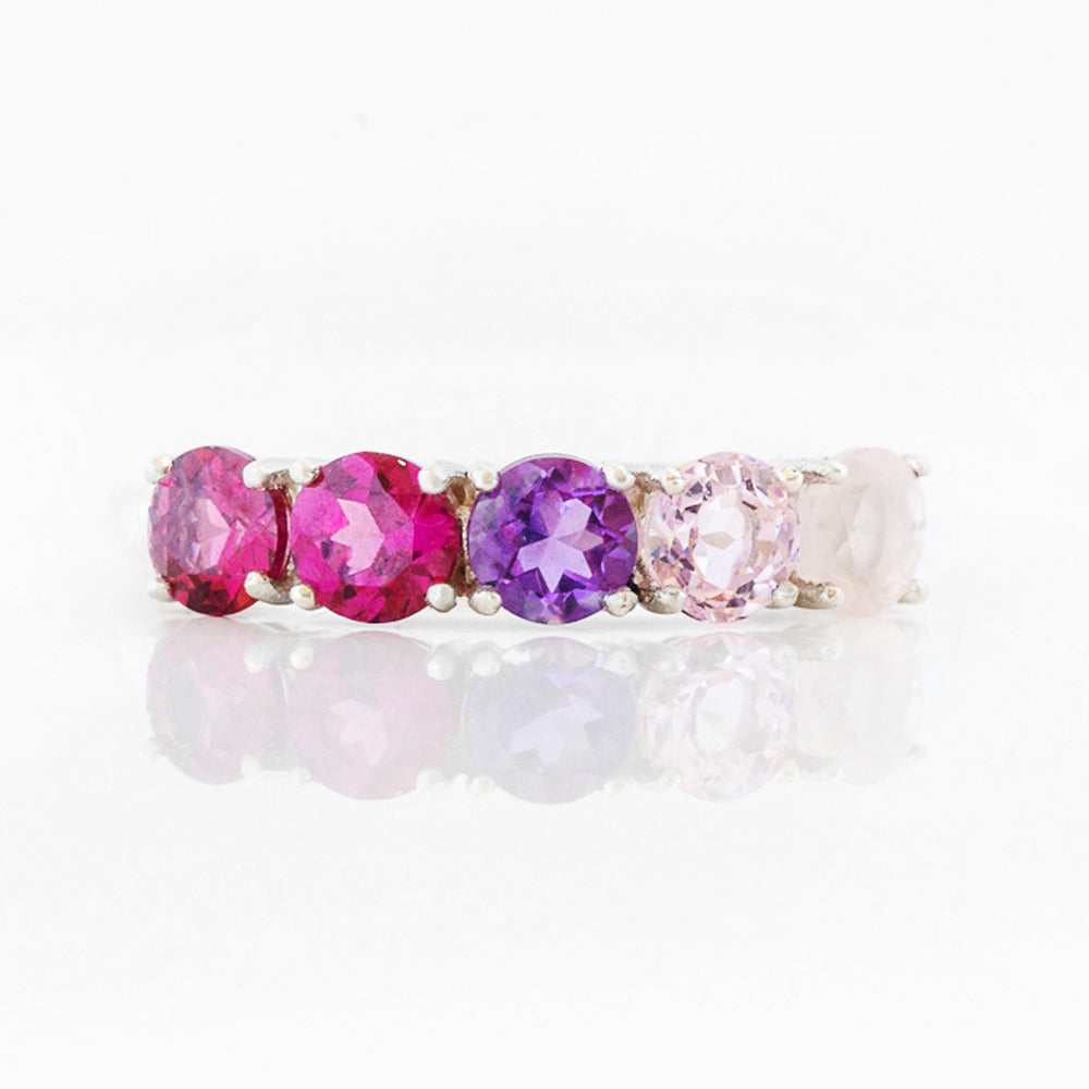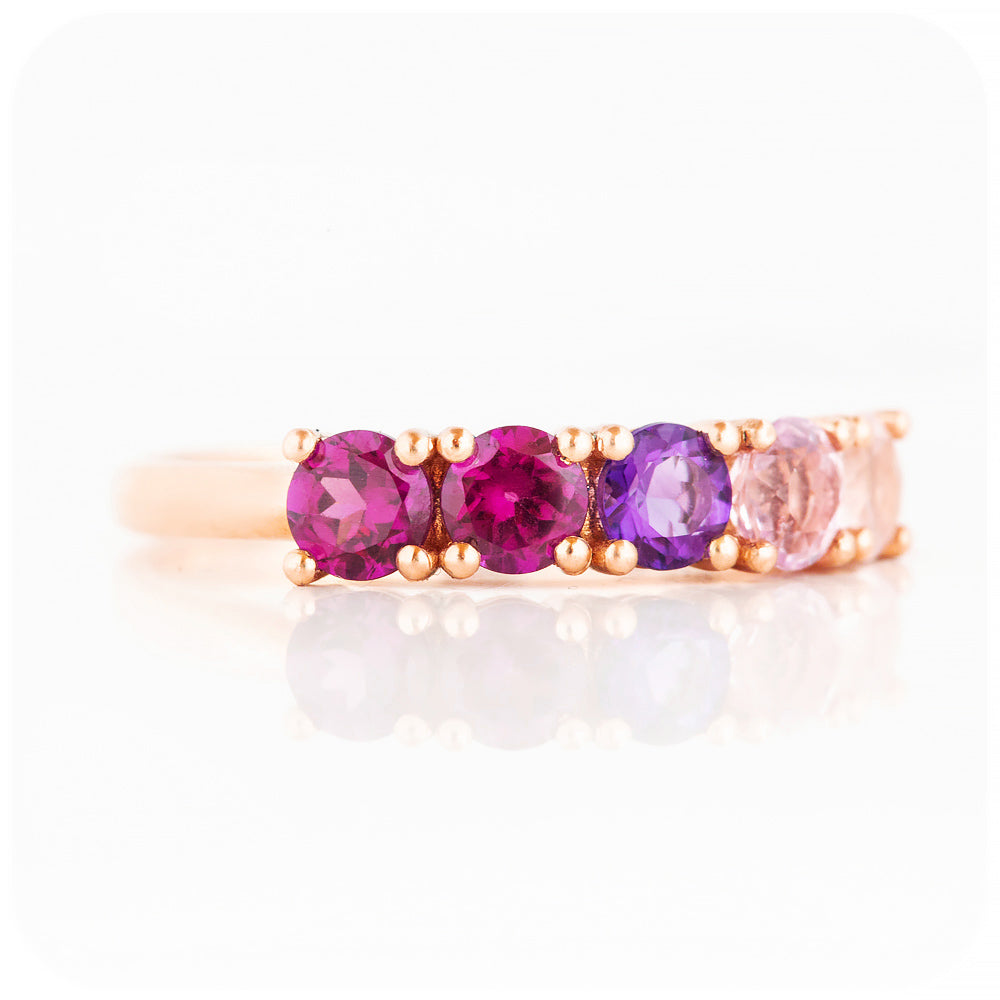 Rhodolite Garnet is the pinkish/red variety of Garnet and has a stunning brilliance and sparkle. It is known as the stone of inspiration and guidance. Amethyst is centred in the ring is said to be a protective stone for the wearer. Morganite is the stone of love in abundance, it attracts, stores and gives love when it's needed. Rose Quartz is the last of the stones and restores trust and harmony and creates inner peace.