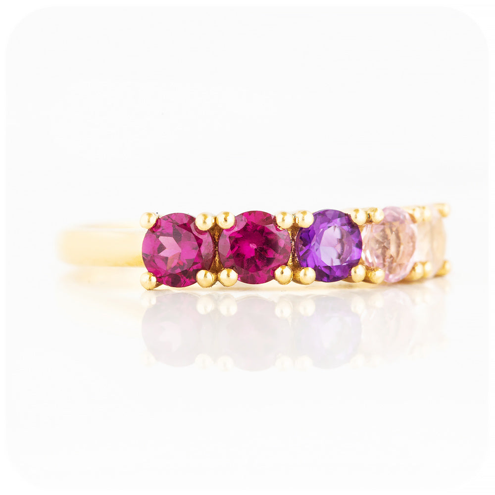 Not just for a January birthday, but it makes the perfect gift for someone who doesn't like red Garnets. This ring features five round cut stones each measuring 4mm in size and expertly set and finished by hand.