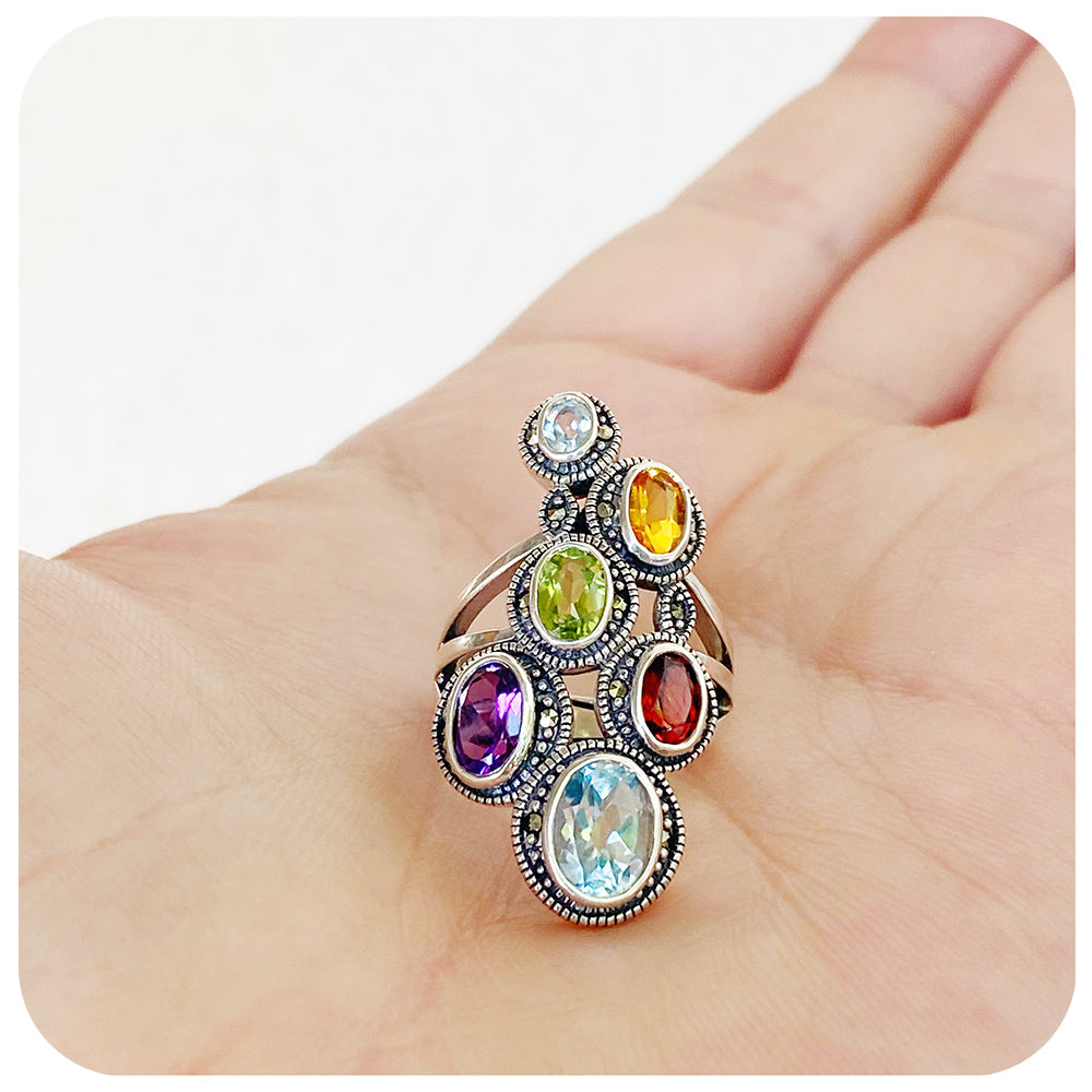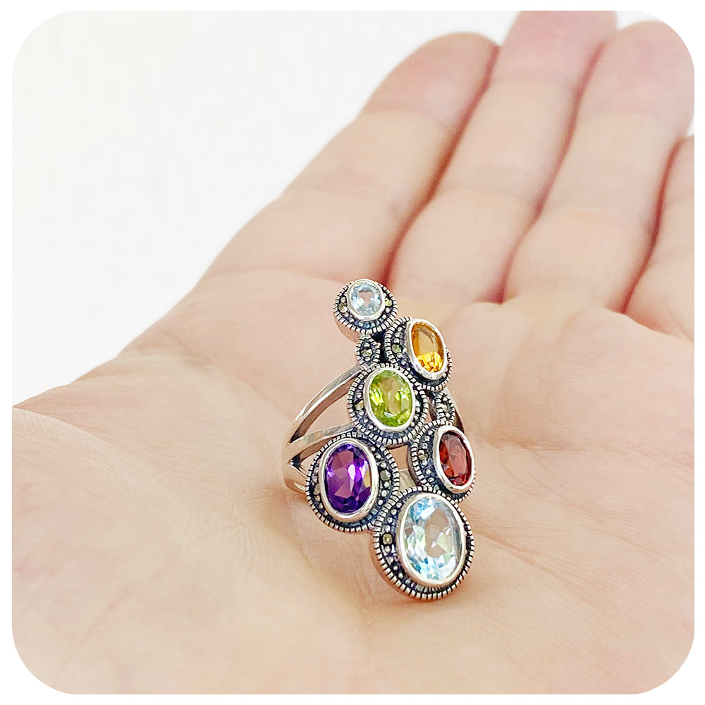 The Rainbow Multi-Colour Ring in Sterling Silver with Marcasite